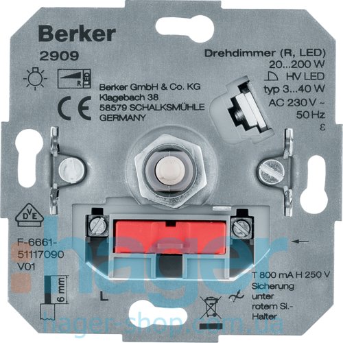 Диммер поворотний, ЛН/ВВГЛ 20-200Вт, LED 3-40Вт, 230В Berker 2909