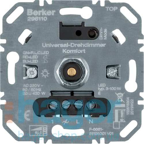 Диммер поворотний, універсальний, 'Комфорт' ЛН/ВВГЛ 20-420Вт, LED 3-100Вт, 230В Berker 296110